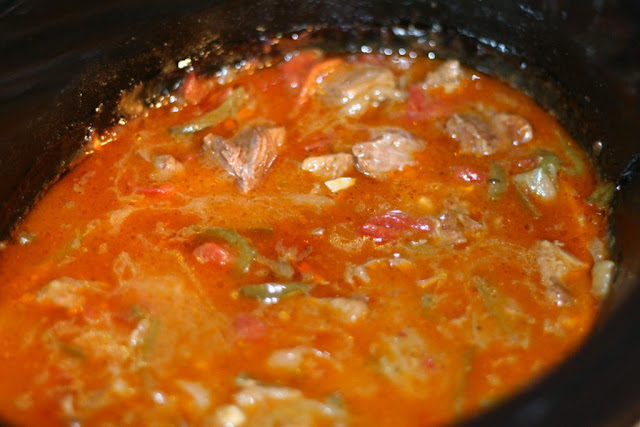 Its basically beef, peppers, and onions in a thick tomato based gravy.